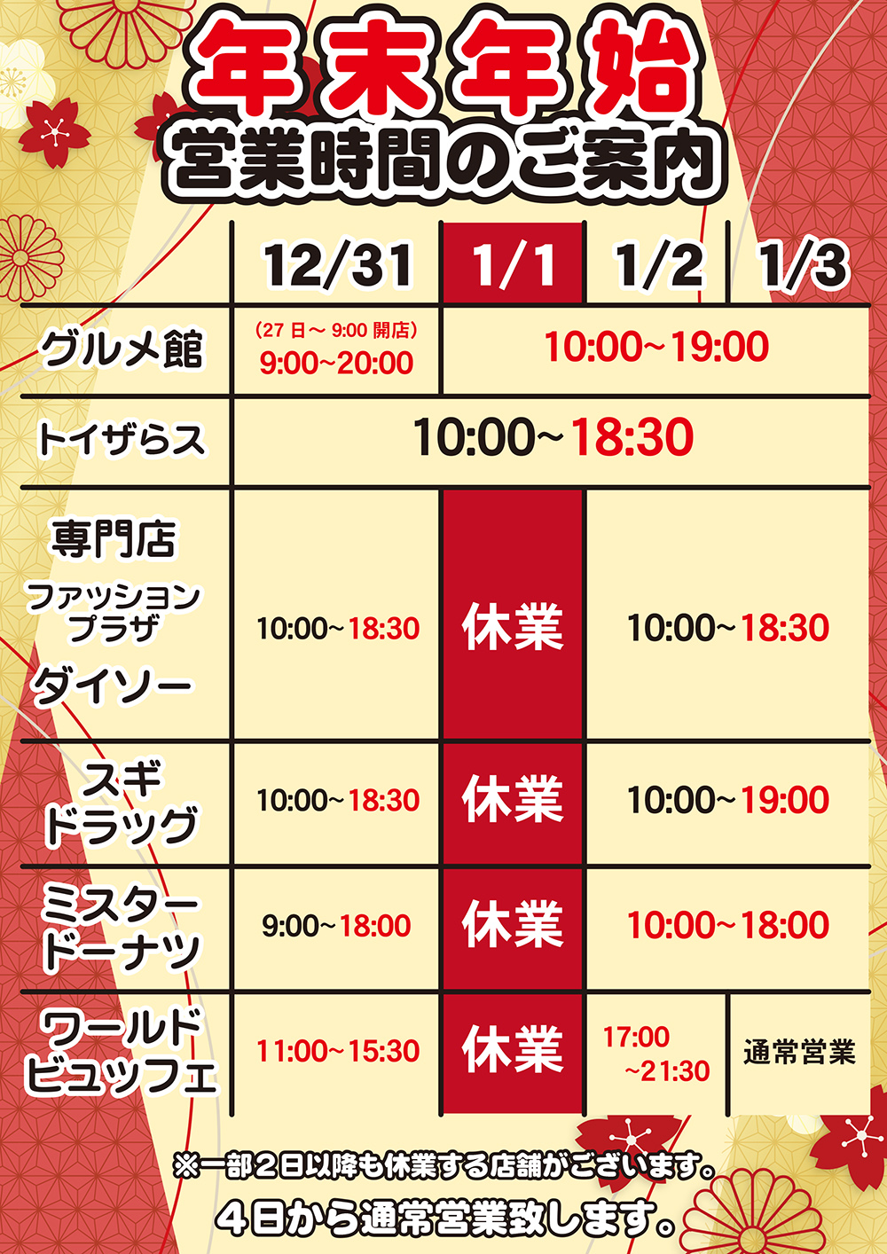 2026年1月1日(木・祝)はトイザらス、グルメ館、まいもんの3店舗のみ営業となります。