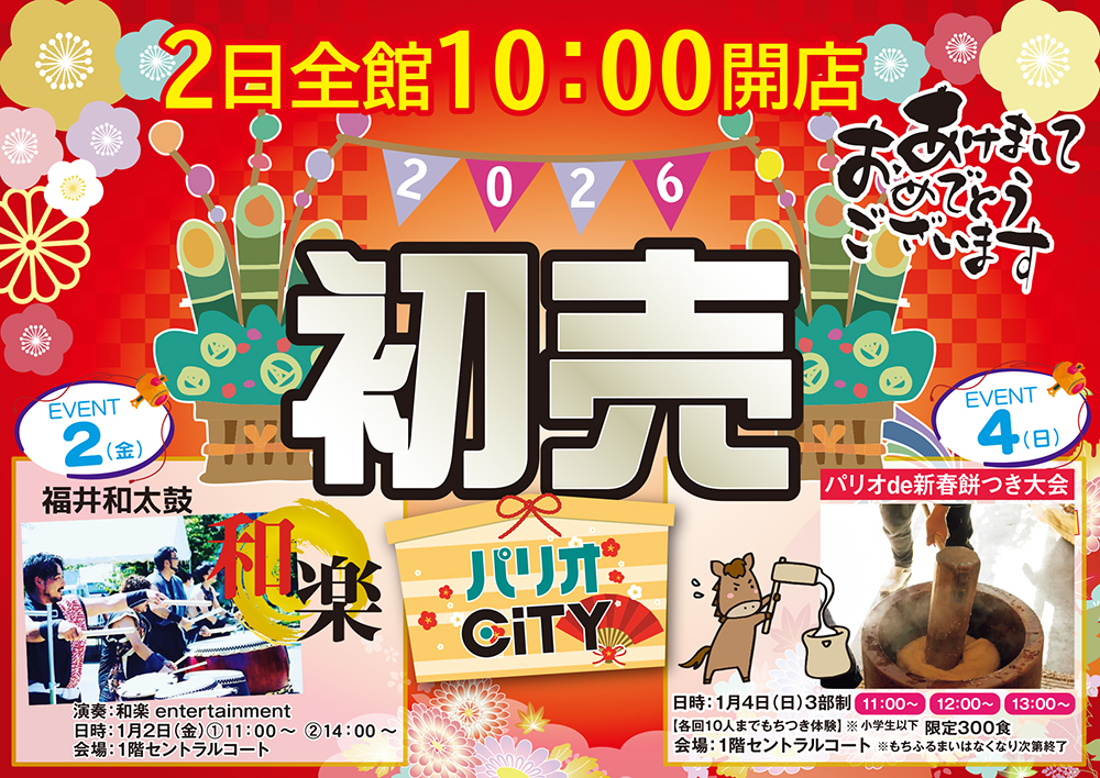 パリオCiTYの新春初売!★2日10時より全館オープン!!地元福井で活躍する!!★和太鼓パフォーマンス 和楽■日時:2日(金) ①11:00~ ②14:00~■会場:1階セントラルコートパリオで新春!!★餅つき大会!つきたてのお餅を食べよう!■日時:4日(日)11:00~ 12:00~ 13:00~■会場:1階セントラルコート各回体験10人 ※小学生以下 【限定300食】★専門店にてバーゲンも開催!!2026年もパリオCiTYをよろしくお願いたします!!