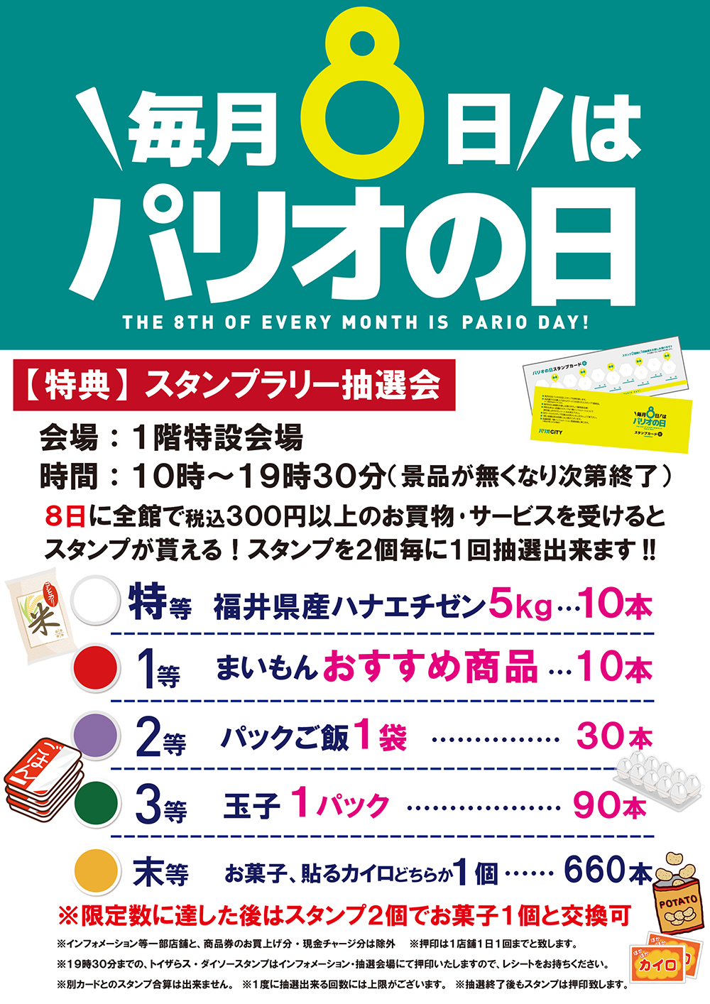 8日に全館で税込300円以上お買物やサービスを受けるとスタンプが貰える!