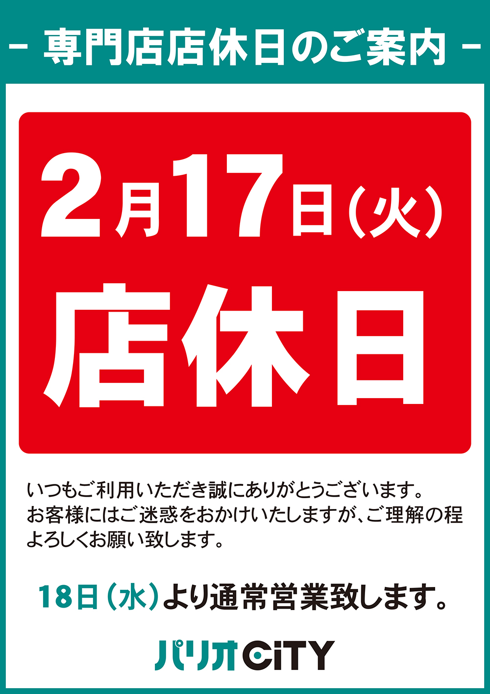 誠に勝手ながら、2月17日(火)は、全館店休日とさせていただきます。翌日18日(水)より通常営業いたします。ご来店こころよりお待ち致しております。