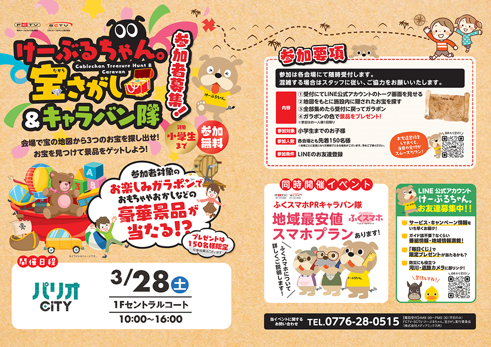 3月28日(土)けーぶるちゃん。宝さがし&キャラバン隊イベント開催参加者募集!!会場で宝の地図から3つのお宝を探し出せ!お宝を見つけて景品をゲット!※お1人様1回限り参加対象:小学生までのお子様参加人数:各会場とも先着150名様参加条件:LINEのお友達登録