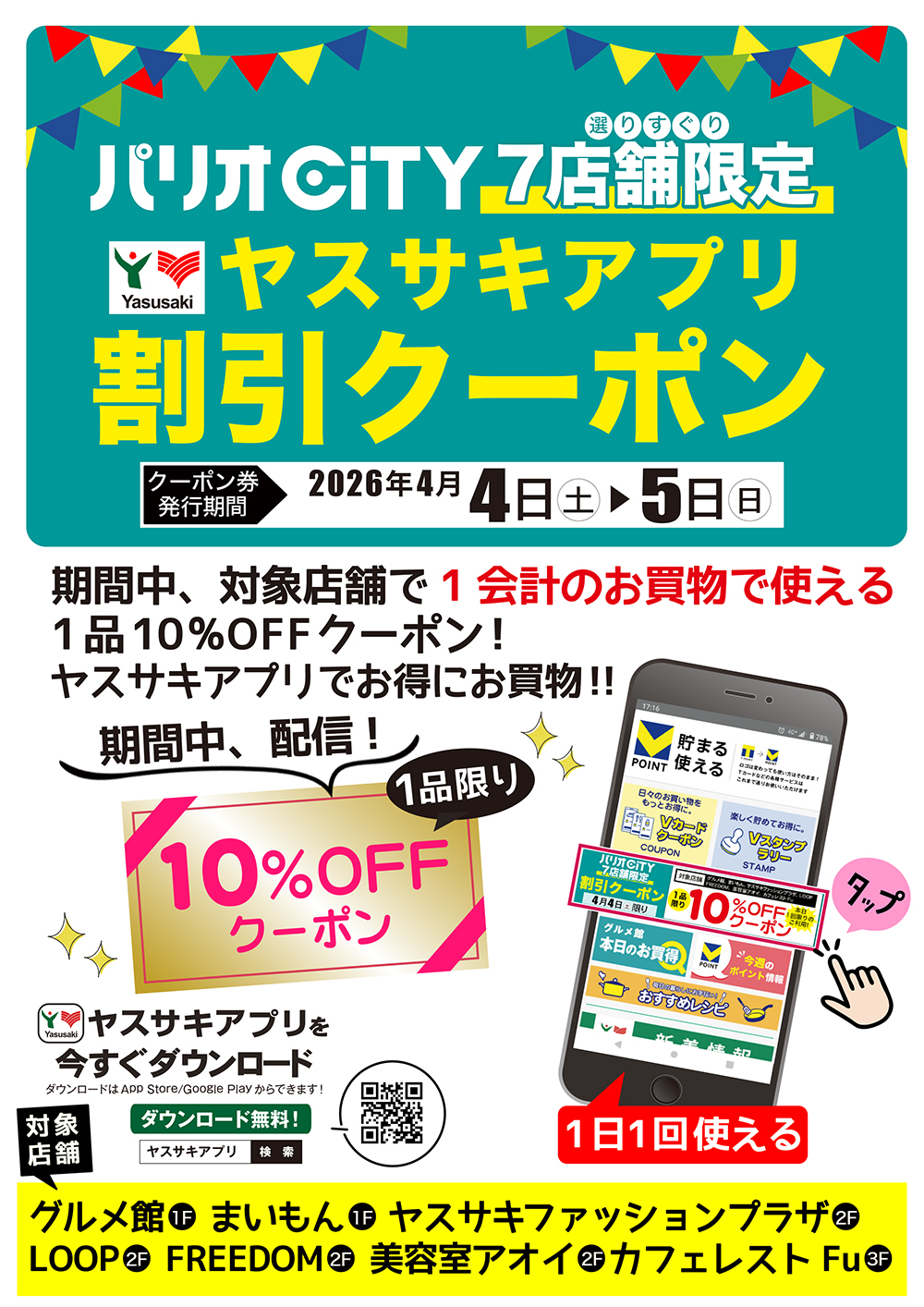 ヤスサキアプリをダウンロードして、毎日1回対象店舗で使える割引クーポンをGETしよう!