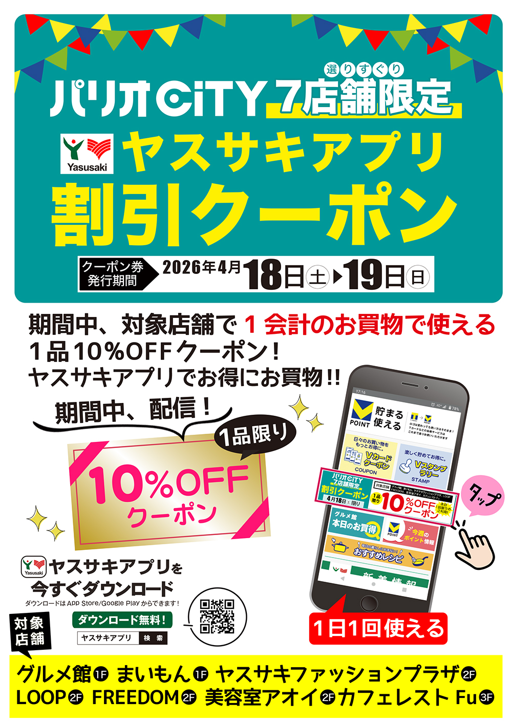 ヤスサキアプリをダウンロードして、毎日1回対象店舗で使える割引クーポンをGETしよう!